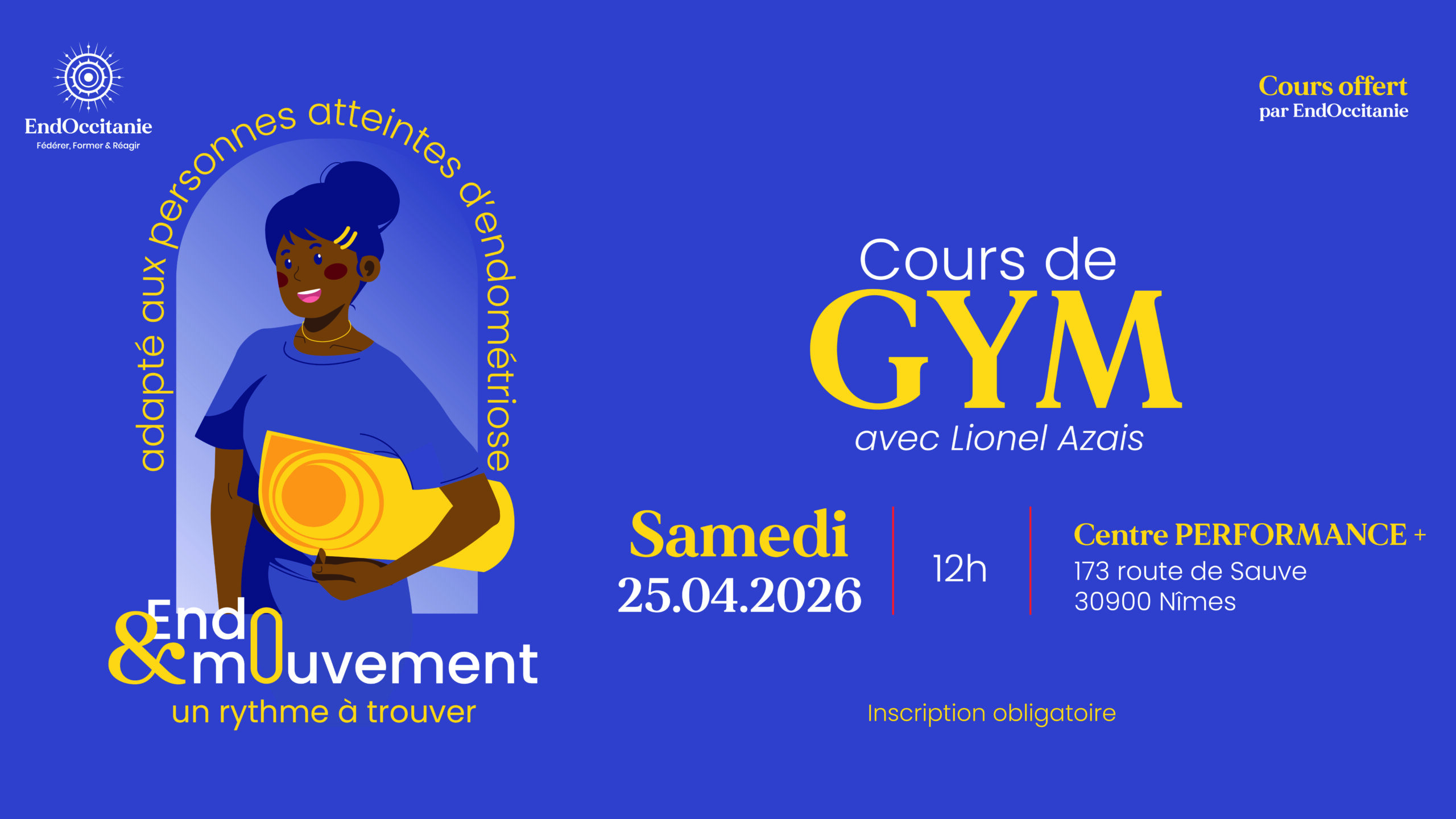 Endo & Mouvement, un rythme à trouver Afin de favoriser la pratique sportive auprès des personnes atteintes d’endométriose, la filière EndOccitanie met en place des cours d’initiation gratuits spécialement adaptés. Lionel AZAIS, coach sportif vous propose une session de gym, d’une durée de 1h, le samedi 25 avril à midi. Les places étant limitées, nous vous remercions […]